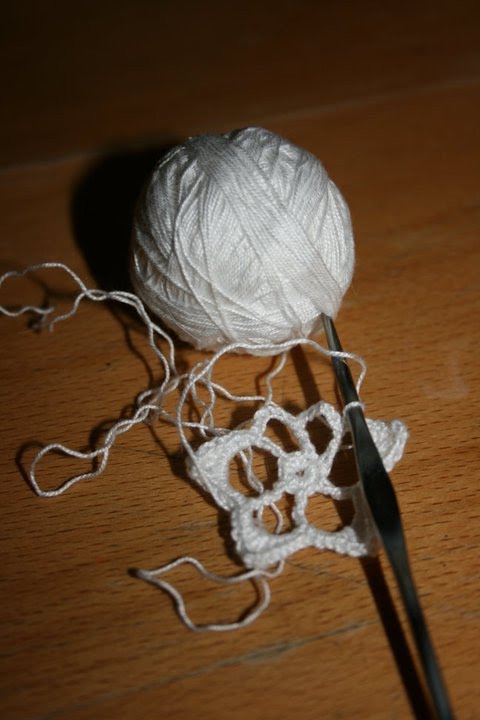 Ég fann svo æðislega konu á Ravelry sem býr til fáránlega flott snjókorn og allar uppskriftirnar hennar eru gefins á blogginu hennar. Ég valdi þetta því það er sæmilega auðvelt að hekla en er samt mjög flott.Ég notaði DMC hekl garn og nál nr. 1,25