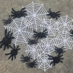 Uppskriftin af köngulóunum er hægt að sækja sér frítt hér. Í köngulærnar var notað DROPS Safran og DROPS Puna, til þess að fá stærri köngulær var notaður tvöfaldur til fjórfaldur þráður af þessu garni saman.