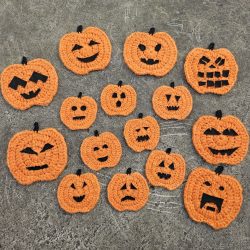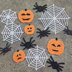 Uppskriftin af graskerjum og köngulóavefunum var keypt hér. Í graskerin var notað DROPS Air, einfaldur þráður í þeim minni en tvöfaldur í þeim stærri. Í köngulóavefina var notað DROPS Flora og DROPS Kid-Silk.