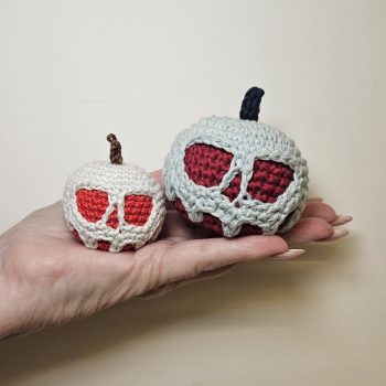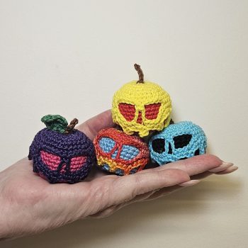 Eitruðu eplin hafa vakið mikla lukku og er uppskriftin af þeim keypt á Ravelry. Litlu eplin eru hekluð úr Scheepjes Catona á nál nr. 3. Stærri eplin eru hekluð úr tvöföldu DROPS Safran á nál nr. 5.
