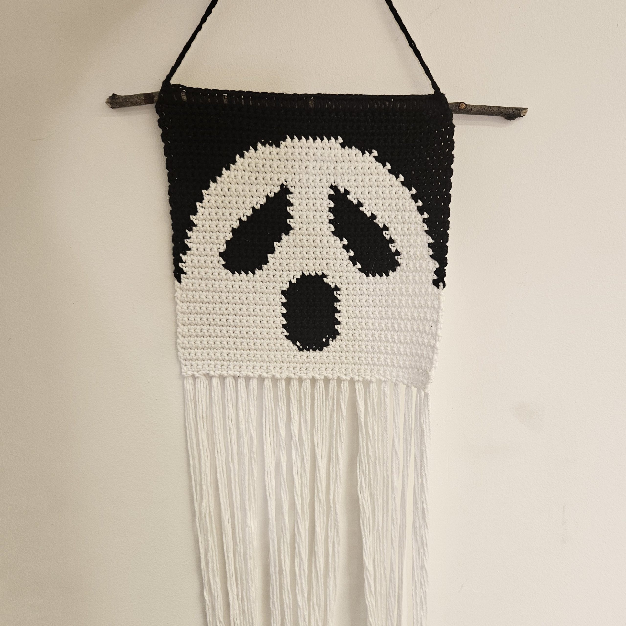 Tapestry vegghengis draugurinn hefur líka vakið mikla athygli. Uppskriftin af honum er keypt á Etsy. Guðmunda notaði DROPS Paris í drauginn, 2 hvítar dokkur og 1 svört, og nál nr. 5.