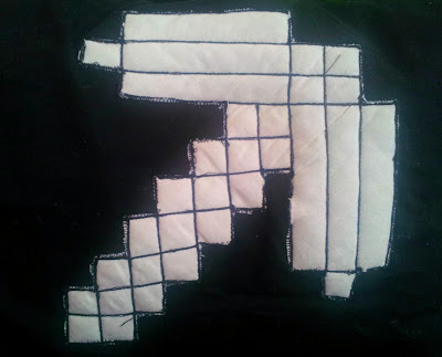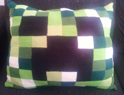 Svarta púðann saumaði Mikael svo í skólanum og fékk 10 í einkunn fyrir vikið. Þetta er haki, vinsælasta áhaldið,  úr Minecraft líka.