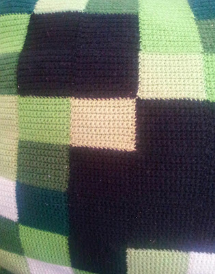 Ég gaf Mikael eldri syni mínum heklaða gjöf um jólin. Ég heklaði 100 stk af ferhyrningum úr fastapinnum og saumaði þá saman. Garnið er Kambgarn og ég notaði nál nr 3, 5.