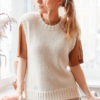 Vestið er prjónað í sléttu prjóni með köntum í stroffprjóni, v-hálsmáli og klauf í hliðum
