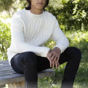 Prjónuð peysa fyrir herra með laskalínu og köðlum. Stykkið er prjónað úr Drops Karisma eða Drops Sky.