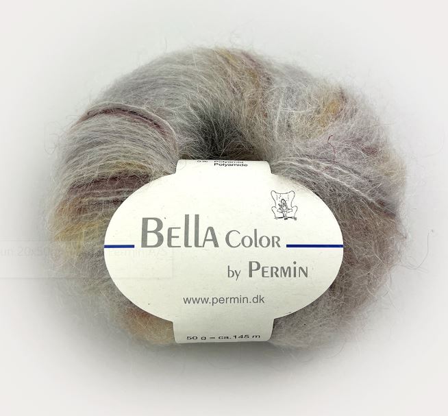 Bella er ein vinsælasta garntegundin hjá Permin. Samsetningin er klassísk kid mohair og ull, sem gefur loðið og sítt yfirbragð með löngum mohair þráðum. Garnið er létt og hlýtt og hentar sérstaklega vel í stórar peysur, þar sem það heldur léttu og loftkenndu útliti.