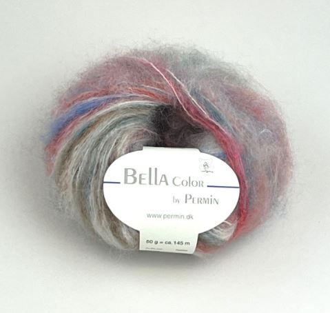 Bella er ein vinsælasta garntegundin hjá Permin. Samsetningin er klassísk kid mohair og ull, sem gefur loðið og sítt yfirbragð með löngum mohair þráðum. Garnið er létt og hlýtt og hentar sérstaklega vel í stórar peysur, þar sem það heldur léttu og loftkenndu útliti.