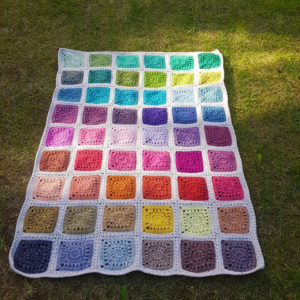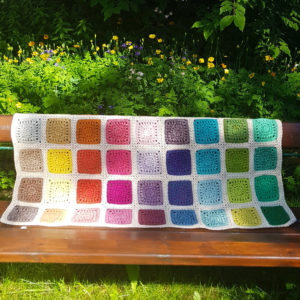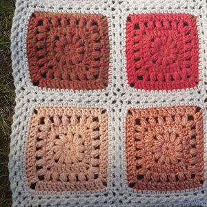 Heklaðar dúllur með púffspori, heklaðar saman með fléttuaðferðinni, útkoman er þetta fallega teppi.