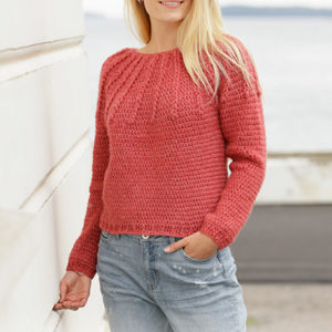 Hekluð peysa með hringlaga berustykki úr Drops Air. Stykkið er heklað ofan frá og niður með áferð.