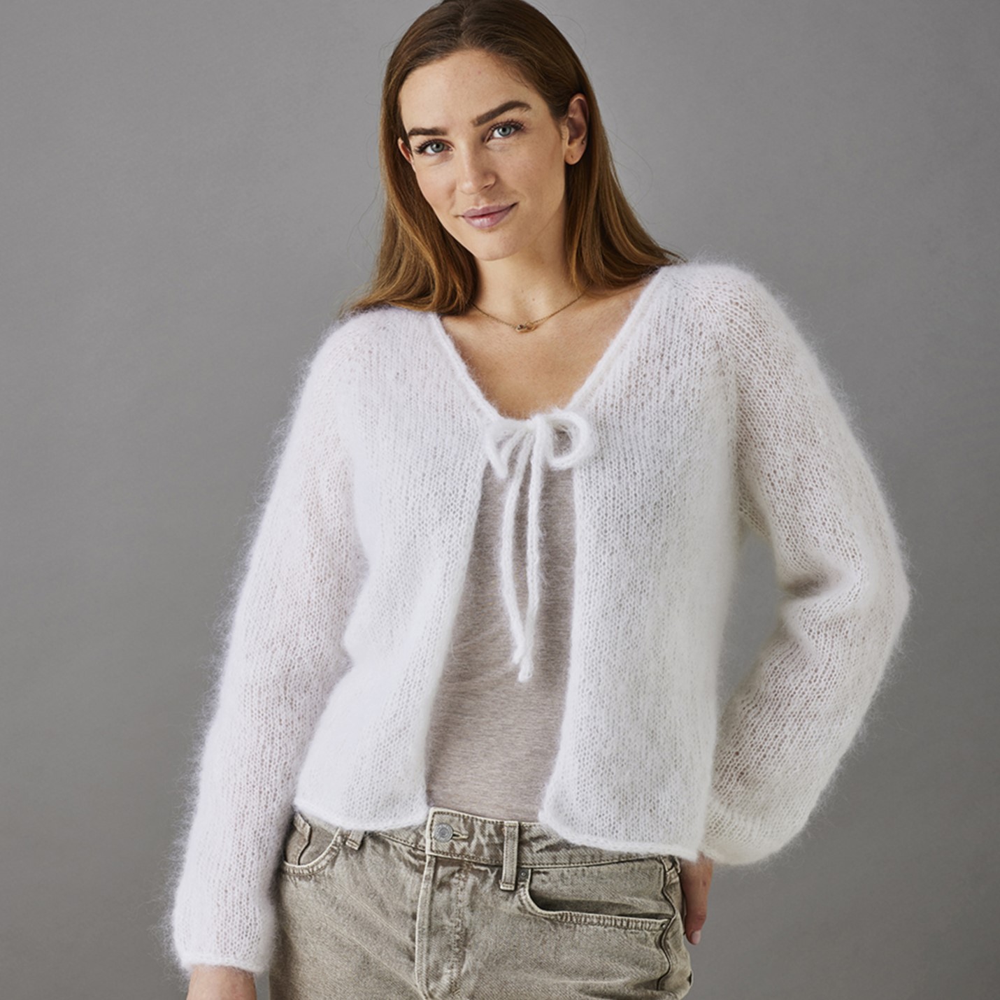 Strikkefasthed: 14 m og 19 p = 10 x 10 cm på p 6 mm eller den p der giver strikkefastheden.