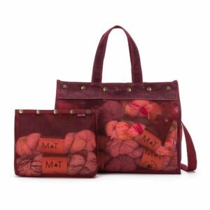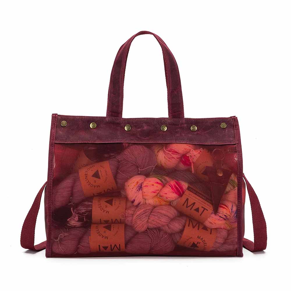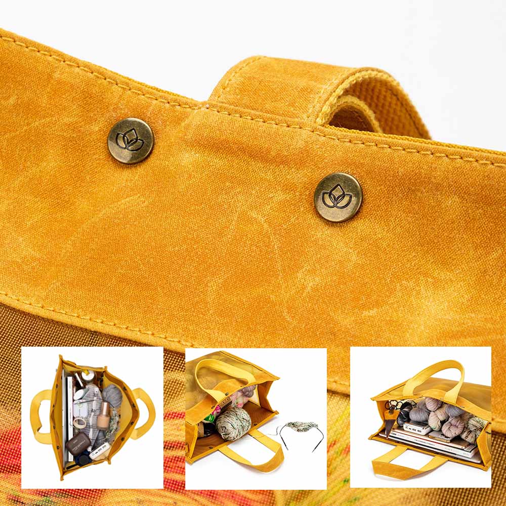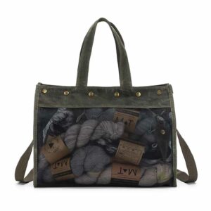 Innan í töskunni er nóg pláss fyrir handavinnuverkefnið, fylgihlutina og uppskriftina, einnig fyrir persónulega hluti eins og til dæmis fartölvu, spjaldtölvu, síma og seðlaveski. Innan í töskunni eru skæri í hulstri og gegnsær vasi fyrir t.d. uppskriftina. Góð handföng og einnig stillanleg ól svo hægt er að hafa töskuna sem handtösku, axlartösku eða á ská yfir öxlina (e. cross-body bag).