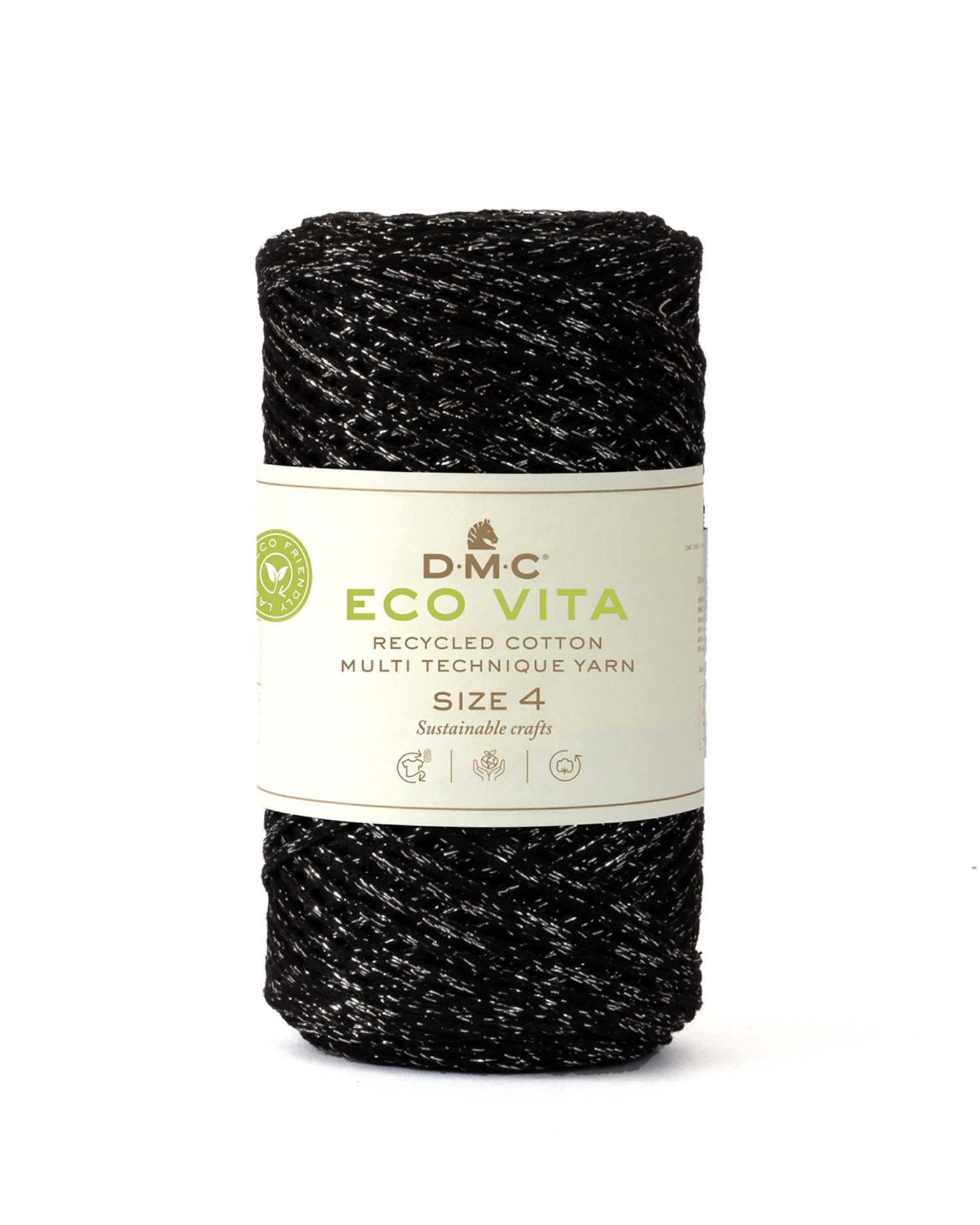 Skemmtilegt endurunnið bómullargarn. 75% endurunnin bómull, 15% polyester og 10% glitþráður. Þráðurinn er 2,5-3mm þykkur. Dokkan er 250g & 200m.