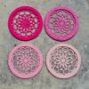 Stærðir: Gatamynstrið opnast vel í strekkingu og lengdust sjölin því nokkuð vel við strekkingu. Bubbles garnið gaf meira eftir en ég bjóst við og varð óreglulega sjalið því stærra en ég reiknaði með. Reglulega sjalið var 64 cm á hæð við miðju og 164 cm á lengd horna á milli fyrir strekkingu, en 71 cm á hæð við miðju og 213 cm á lengd horna á milli eftir strekkingu. Óreglulega sjalið var 59 cm á hæð við miðju og 156 cm á lengd horna á milli fyrir strekkingu, en 66 cm á hæð við miðju og 202 cm á lengd horna á milli eftir strekkingu.