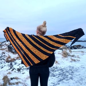 Óreglulega sjalið (svarta & appelsínugula) er heklað úr tveimur ólíkum grunnum frá Dottir Dyeworks, báðir eru þó fingering/4 ply, 100 g / 400 m. Það fóru samtals 300 g í sjalið, 200 g af Night úr Bubbles garni og 100 g af Lava úr 100% Merino garni.