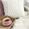 Prjónað púðaver með perluprjóni, köðlum og gatamynstri. Stykkið er prjónað úr DROPS Air.