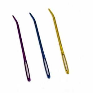 3 nálar í pakka, sami grófleiki á öllum nálum, blandaðir litir. Nálarnar eru sveigðar á endanum og henta vel í frágang á prjóni og hekli.