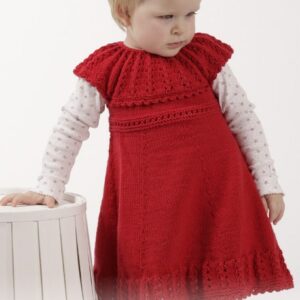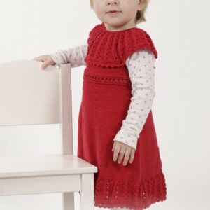 Prjónaður kjóll með gatamynsturs kant og hringlaga berustykki sem og slaufa í hárið með garðaprjóni úr Drops Cotton Merino.