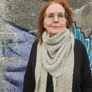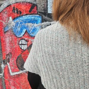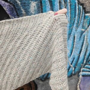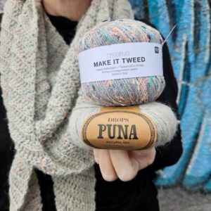 Garn: 6 dokkur DROPS Puna (50g, 110m), litur ljósgrár nr. 07 og 2 dokkur af Make It Tweed fylgiþræði (50g, 475m), litur Earthy nr. 07.