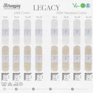 Legacy kemur í tveimur útgáfum: Natural sem er 100% bómull án glans og Mercerized sem er 100% bómull með glans. Garnið í báðum útgáfum er mjúkt, andar vel og með góðum snúningi. Garnið er gert til þess að endast og ber því nafnið Legacy sem þýðir arflegð. Garnið kemur í 2 litbrigðum og 4 grófleikum.