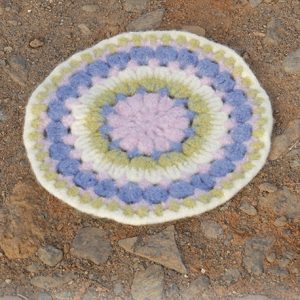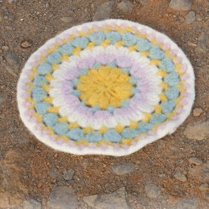 Hekluð/þæfð sessa með röndum og gatamynstri, hekluð í hring frá miðju.