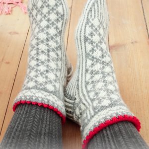 Prjónaðir sokkar úr DROPS Karisma. Stykkið er prjónað með norrænu mynstri.